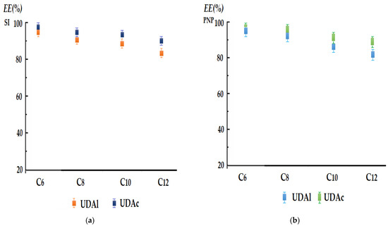 In the case of n-dodecanol, the results obtained indicated extraction efficiencies of at least 85% for the UDAc transporter and slightly lower, 82%, for the UDAl transporter for both target species. In the case of n-hexanol, the efficiency increased with the decrease of the number of carbon atoms in the alcohol molecule to a maximum of 99% in the case of the UDAc transporter and slightly lower, 95%, in the case of the UDAl transporter for both target species.