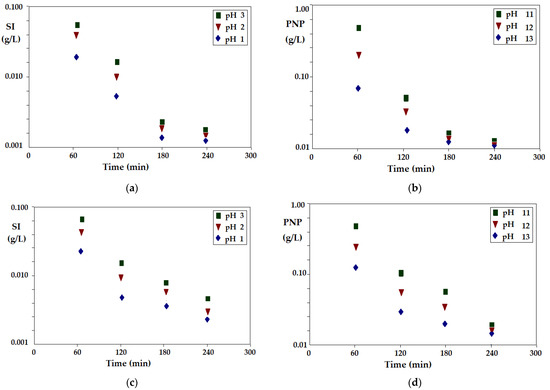 - For the extraction of p-nitrophenol (PNP) (Figure 7b,d): a source phase with pH = 1 (nitric acid) and a concentration of 10−2 mol/L (1.39 g PNP/L), a receiving phase with pH = 11 (sodium hydroxide), a 4% NaNO3 electrolyte in the aqueous phases and a membrane of n-alkyl alcohols with 3 g/L of magnetic nanoparticles.