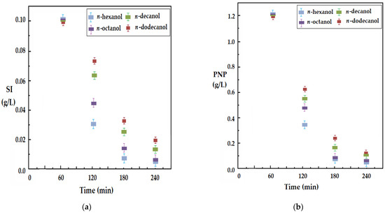 The efficiency of p-nitrophenol (PNP) extraction at 3 h of operation decreased more slowly as the ratio of the source and receiving phase volumes increased (Figure 12b). In this case, all four membrane solvents could be used, with extraction efficiencies that could be accepted at virtually all volume ratios. However, n-dodecanol must be the last one in the selection of the nature of the membrane phase, although it is very useful in terms of its loss in the aqueous phases.