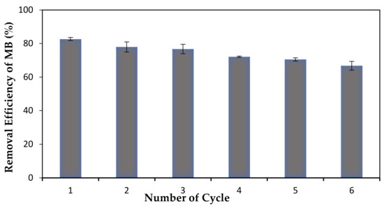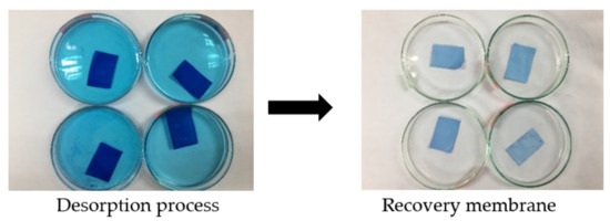 Figure 1). After the adsorption process took place, MB-loaded membrane was dried in the desiccator for 24 h. Then, the membrane was immersed in 50 mL of methanol solution for another 48 h. This cycle was repeated upon membrane recovery. After the required time of the experiments, the amount of dye adsorbed for every cycle was measured by using UV-Visible Spectrometer.
