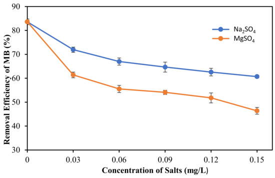 where Co and Ce are the initial and equilibrium concentrations of solutions (mg/L), respectively. The effect of pH solution and ionic strength on adsorption performance was also examined by a fixed amount of 3 mg of porous film and 5.5 ppm of initial concentration of MB under the same conditions and the percentage removal was also determined by using Equation (1).