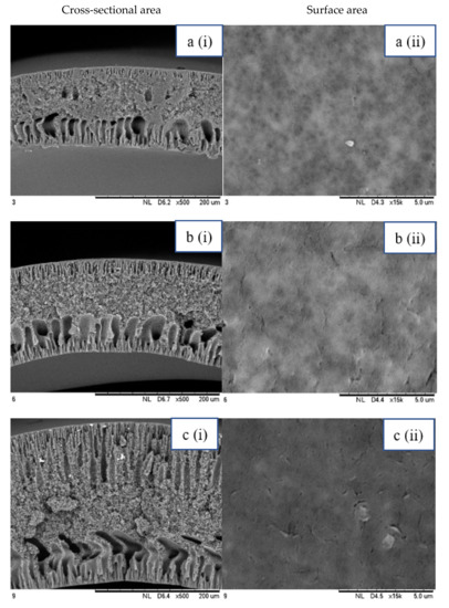 SEM image of 0.25 Cu2O/PVDF DLHF membrane with different outer dope flowrates: (a) 3 mL/min, (b) 6 mL/min, (c) 9 mL/min. Cross-sectional area (i); Surface area (ii).