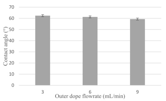 Figure 4 shows the hydrophilicity of Cu2O/PVDF DLHF membrane. With a 3 mL/min outer dope flowrate, the mean contact angle reading for 0.25 Cu2O/PVDF DLHF membrane is 62.39°, 61.27° for 6 mL/min outer dope flowrate and 59.32° for 9 mL/min outer dope flowrate. The mean contact angle reading decreases when the outer dope flowrate increases for 0.25 Cu2O/PVDF DLHF membrane. This indicates that adding a small quantity of Cu2O to the membrane makes it more hydrophilic, whereas a pure PVDF membrane is hydrophobic. PVDF membranes have a very high contact angle of around 92.19°, which is classified as hydrophobic, and after a few treatments, they can attain a contact angle of 120° [47].