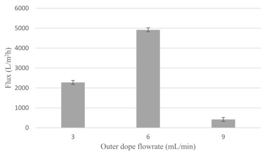 Water flux of Cu2O/PVDF DLHF membrane is shown in Figure 6. Furthermore, 0.25 Cu2O/PVDF DLHF membrane flux values are 2278.62 L/m2h for 3 mL/min outer dope flowrate, 4919.02 L/m2h for 6 mL/min outer dope flowrate and 421.37 L/m2h for 9 mL/min outer dope flowrate. The results reveal that a 6 mL/min outer dope flowrate performs well on water flux readings. Membrane water flow is influenced by membrane pore size and porosity. High membrane water flow is aided by large pore size and porosity [50]. Furthermore, 9 mL/min outer dope flowrate has the least flux. This is not unconnected to its small pore size and poor porosity. In addition, it can also be related to the membrane thickness as shown in Table 2. Furthermore, 9 mL/min outer dope flowrate has the maximum outer layer membrane thickness. Thus, increasing the membrane thickness and increasing the filtration pathway of the membrane. As is established, thicker membrane has lower flux [51].