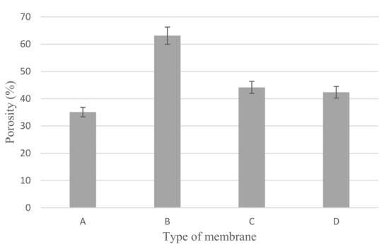 Increase in membrane porosity is governed by increase in membrane pore size [48]. PVDF membranes for microfiltration and ultrafiltration have wide pore sizes ranging from 150 to 450 nm [49]. The PVDF membrane has a porosity of more than 80%. The study backs up the claim that increasing pore size increases membrane porosity, and that the membrane’s application is determined by pore size selectivity, which can be microfiltration, ultrafiltration, nanofiltration or reverse osmosis.
