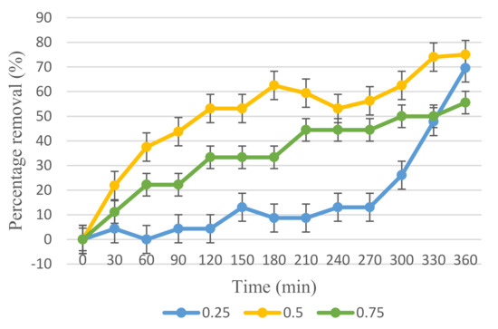 Based on the findings, it was determined that increasing the photocatalyst loading might have enhanced the membrane’s water flow. However, once the membrane has achieved its maximum photocatalyst concentration, adding more photocatalyst would reduce the water flux performance. The water flow of the 0.75 Cu2O/PVDF DLHF membrane began to decrease, indicating that the amount of photocatalyst is too large and compacted for the membrane to function properly. This can also happen when photocatalyst clumps together on the membrane’s outer layer, clogging holes and lowering membrane permeability [58]. As a result, the ideal ratio for the membrane to perform optimally is the 0.5 Cu2O/PVDF DLHF membrane.