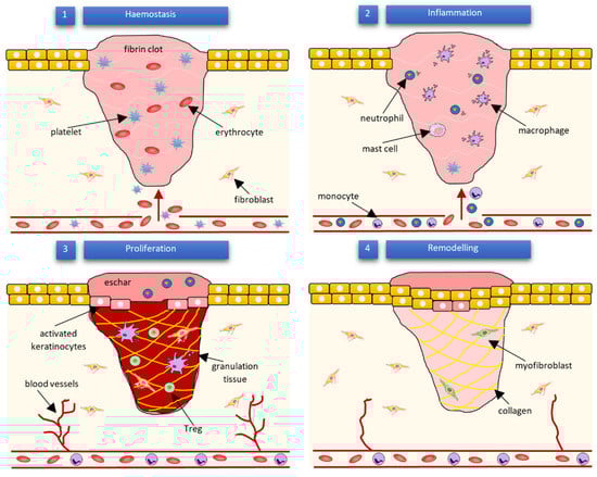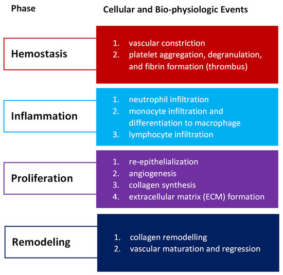 Wound healing refers to a replacement of missing and devitalized cellular and tissue structures in living organisms [5]. Although the mechanism of the process is well known, discrepancies still appear in its characterization due to the complexity and dynamic course of its action. According to contemporary concepts, the human wound healing process consists of the four main stages: hemostasis, inflammation, proliferation, and remodeling with scar tissue formation [6,7,8]. On the other hand, the previous models do not distinguish hemostasis but treat it as a part of the inflammatory phase [9,10,11]. Moreover, some authors used maturation or resolution names instead of the remodeling or granulation names or instead of proliferation when describing the distinct stages.