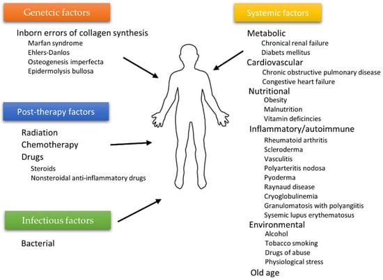 The wound healing process depends on many individual and environmental factors. For example, the patient’s age weakening the body’s innate ability to regenerate [28], ischemia [29,30], or microbial infections often limit therapy’s effectiveness. Generally, two types of agents affecting wound healing can be highlighted: local factors directly influencing the wound characteristics and systemic ones related to the patient’s overall state affecting the healing process. Age, gender, stress, ischemia, chronic diseases, level of sex hormones, nutrition, underlying comorbidities, or addictions (alcoholism) are examples of factors from the second category, whereas infections, venous sufficiency, and oxygenation [31] can be categorized as local agents [12]. Some authors distinguish additional subcategories. The diagram in Figure 3 shows the division inspired by the work of the Beyene group [32].