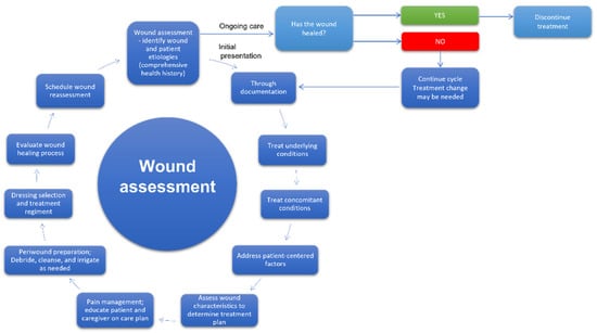 The development of effective wound treatment is one of the main goals of modern medicine. According to Gupta and co-workers, wound management is a holistic cycle, encompassing the procedures related to the care of patients with wounds, starting from diagnosis and ending in follow-up. The steps of that ongoing process include wound recognition and characterization, risk assessment, selection of the optimal treatment, preparation of wound bed, monitoring, and taking practical actions depending on the observation results and evaluation of the effectiveness of the applied therapy [53]. Furthermore, effective wound care management can shorten the treatment and lower its costs, particularly in the case of chronic wounds therapy [54]. Therefore, medical personnel must pay special attention to adapting existing protocols to the individual needs of specific patients [55,56]. The appropriate dressing selection fitting the wound characteristic manifests such an approach [54,57]. In Figure 4, the model of a cycle of wound assessment and decision-making as to procedures is shown.