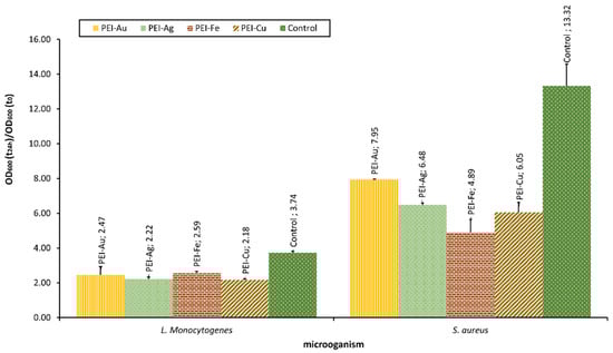 The optical density of bacterial strains L. monocytogenes and S. aureus after 24-h culture in the presence of nanocomposite membrane material based on polyethyleneimine (PEI) with incorporated metallic NPs. Key to the symbols: PEI-Au—polyethylenimine incorporating gold nanoparticles; PEI-Ag—polyethylenimine incorporating silver nanoparticles; PEI-Fe—polyethylenimine incorporating Fe3O4 nanoparticles; PEI-Cu—polyethylenimine incorporating copper nanoparticles. The values are presented as mean ± SD.
