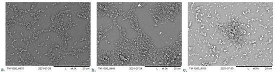 The SEM visualization of nanocomposite material based on polyethyleneimine (PEI) with incorporated AuNPs or AgNPs with A. baumanni after 24-h cultivation. (a): PEI—AuNPs membrane; (b): PEI—AgNPs membrane; (c): Control—A. baumanni after 24 h of cultivation without membrane.