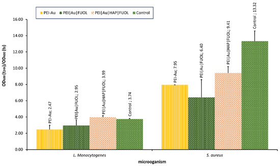The optical density of bacterial strains L. monocytogenes and S. aureus after 24-h culture in the presence of nanocomposite membrane material based on polyethyleneimine (PEI) with incorporated AuNPs. Key to the symbols: PEI-Au—polyethylenimine incorporating gold nanoparticles; PEI|Au|FUOL—polyethylenimine incorporating gold nanoparticles and fullerenol, PEI-Au|HAP-FUOL—polyethylenimine incorporating gold nanoparticles and hydroxyapatite mixed with fullerenol. The values are presented as mean ± SD.
