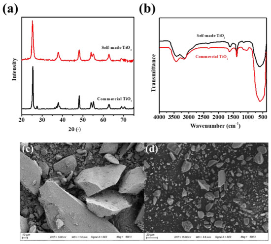 (a) XRD pattern of the self-made TiO2. (b) FT-IR spectra of commercial and self-made TiO2/PVDF composite membranes. (c,d) SEM picture of the self-made TiO2.