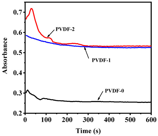 The phase separation rate and pore structure are affected by the mass transfer process. The phase separation velocity of casting solution in the process of membrane forming was analyzed by studying the absorbance change of DMF in deionized water. As shown in Figure 3, the absorbance of DMF in the casting solution with particles is greater than that of the blank casting solution. The results show that TiO2 particles accelerate the phase separation speed, which is due to the barrier of nanoparticles reducing the interaction force between polymer and solvent. Thus, the solvent molecules were more easily diffused from polymer matrix. In addition, the phase separation rate of PVDF membrane prepared by adding self-made TiO2 particles is higher than that of commercial TiO2 particles, which indicates that the self-made TiO2 particles are more conducive to the diffusion of solvent into water. The high phase separation speed indicates that the exchange rate between solvent and non-solvent is high, which was conducive to the formation of porous structure of the membrane, thus improving the filtration performance.