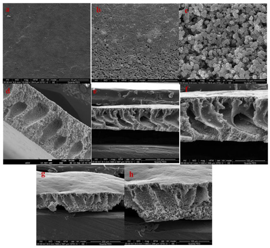 SEM pictures of (a) PVDF-0, (b) PVDF-1, and (c) PVDF-2. Section of (d) PVDF-0, (e,f) PVDF-1, and (g,h) PVDF-2.