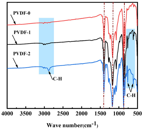 FTIR spectroscopy of the PVDF-0, PVDF-1, and PVDF-2.