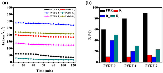 From Figure 7a, the pure water flux of PVDF membrane prepared by adding particles was greatly improved. Compared with the PVDF-0, the pure water flux of PVDF-2 increased to 288.3 L·m−2·h−1 and bovine serum albumin flux also increased 221.2 L·m−2·h−1. Notably, the flux of PVDF-2 did not change with time, indicating that the self-made TiO2 particles can effectively improve the pore structure and pores of the membrane.