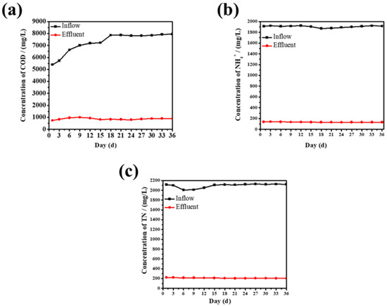 (a) Removal of COD; (b) removal of NH4+; (c) removal of TN.