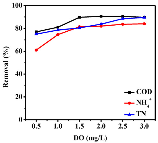 Effect of dissolved oxygen on COD, NH4+, and TN removal.