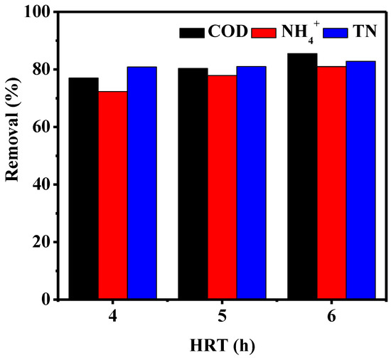 As can be seen from Figure 11, with an increase in hydraulic retention time, the average removal rate of total nitrogen changed little (about 80%), possibly because, within a certain range, the hydraulic residence time of the system is positively correlated with the total nitrogen removal ability, but beyond a certain range, this residence time will lead to a large number of heterotrophic bacteria reproducing, thus inhibiting the activity of nitrifying bacteria, which is not conducive to denitrification, ultimately resulting in a low total nitrogen removal rate.
