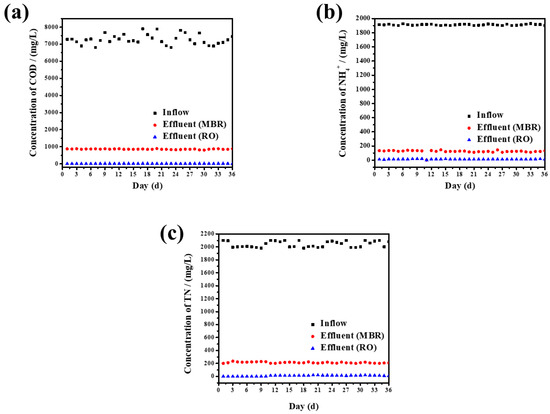 It can be seen from Figure 8a that during the operation of the system, the variation in COD in the influent is relatively large, ranging from 5000 to 8000 mg/L, which may be caused by the water quality characteristics of the leachate itself. However, the COD in the effluent of the system is relatively stable. The average COD removal rate of the system can reach 88%. It can be seen that the system features a good removal effect for COD and has a strong anti-impact load capacity that maintains a relatively stable removal rate. Ultrafiltration membranes play an important role in the system under a high organic load, which stabilizes and strengthens the quality of the leachate effluent and stabilizes the COD of the leachate effluent. In addition, the remaining 800 mg/L of the COD may be unable to be removed because most of the non-biodegradable and insoluble substances have also not been effectively removed.