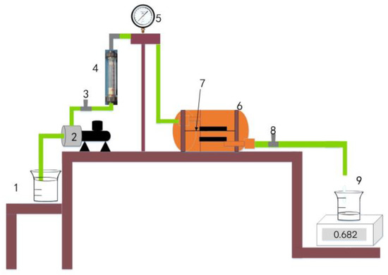 Membrane separation equipment. 1: Container for solution; 2: Pump; 3: Inlet control valve; 4: Liquid flow meter; 5: Inlet pressure gauge; 6: Flat membrane module; 7: Flat sheet membrane; 8: Outlet control valve; 9: Permeation.