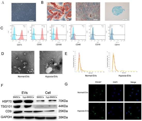 EVs were isolated from the BMSC supernatant by ultracentrifugation. The purified BMSC-EVs were identified by TEM, NTA, and Western blotting. TEM showed that the EVs exhibited an oval shape (Figure 1D). The NTA revealed that the average vesicle diameter was approximately 150 nm (Figure 1E). Western blot analysis of EV lysates revealed a positive expression of the EV surface markers HSP70, TSG101, and CD9 (Figure 1F). Collectively, these results confirm the successful isolation of EVs from the supernatant of BMSCs. We performed these analyses on hypoxia-derived EVs, and the results showed that BMSCs can also secrete EVs in a hypoxic environment.