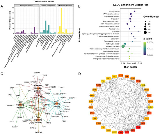 Three types of annotations for GO functions were conducted for possible target genes. The various GO functions are shown in Figure 5A and include cell migration (GO:0016477), regulation of chondrocyte differentiation (GO:0032330), Wnt signaling pathway (GO:0016055), and apoptotic process (GO:0006915) in the BP category; Golgi apparatus, plasma membrane endoplasmic reticulum, and nucleoplasm were identified in the CC category; and transcription factor binding, protein binding, and DNA binding were identified in the MF category. KEGG pathway enrichment analysis was performed to investigate the pathways of these target genes, including the MAPK, RAS, PI3K-Akt, and Rap1 signaling pathways (Figure 5B,C).