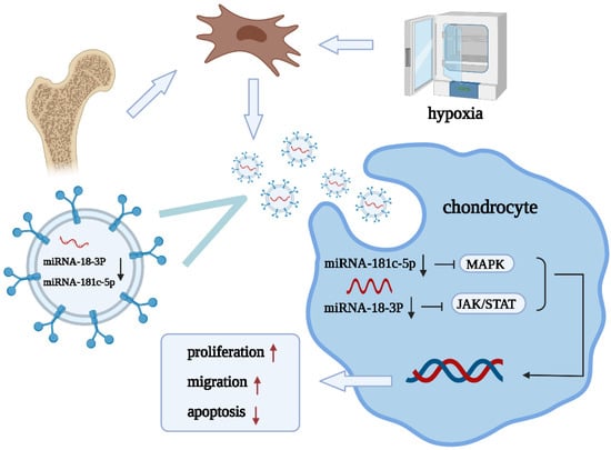 We verified that BMSC-EVs promote proliferation and migration and inhibit apoptosis during cartilage repair and that hypoxic pretreatment improves these repair functions. This improvement may be due to changes in miRNA expression, and the underlying mechanism may involve the miRNA-18-3P/JAK-STAT or miRNA-181c-5p/MAPK signaling pathway. In the future, miRNAs that are combined with EVs will serve as a new strategy for the treatment of OA.