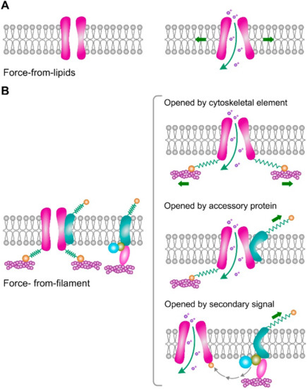 Two general models of channel gating by mechanical stimuli. (A) In the force-from-lipids model, surface tension of the membrane causes a hydrophobic mismatch that opens the channel. (B) In the force-from-filament model, specific accessory proteins are bound to the channel, mechanical stimulus, or secondary signal produced by these proteins can open channel. Figure based on reference [24].