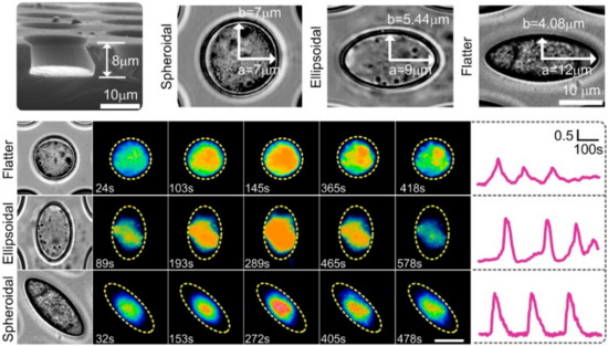 Bright field images of chondrocytes show single cell encapsulated in a microniche with different geometries. Representative single cell images showing Ca2+ oscillations at given time points from one chondrocyte in the spheroidala, ellipsoidala, and flattera microniches. Yellow dashed line represents the boundaries of microniche. TRPV4 and PIEZOs may be involved in mediating calcium signaling. Figure based on our recent publication [67].