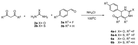 Recently, we showed that δ-lactones show high biological activity in terms of action on bacterial lipopolysaccharide (LPS) in model strains of Escherichia coli K12 (without LPS in its structure) and R2–R4 (LPSs of different lengths in its structure) [41]. Therefore, we were interested in whether the same effect of fluorine presented in the structure of the investigated DHPMs would modulate their antimicrobial activity, as was observed for δ-lactones. For this purpose, it was necessary to develop a method to provides DHPMs containing fluorine in their structure. A series of target DHPM 4s were prepared via Biginelli reaction and catalyzed by ammonium chloride under solvent-free conditions (Figure 2). The desired DHPMs were obtained with the yields ranging from 56% to 82% (Table 1). The developed method turned out to also be effective for the synthesis of thioxopyrimidine derivative 5j, which was provided with up to 76% of isolated yield. In order to verify the impact of the fluorine atom on biological activity, DHPMs without fluorine substituents (6a and 6b) were obtained (Table 1).