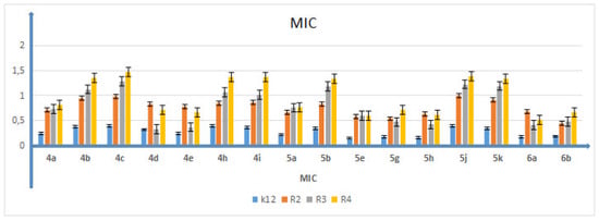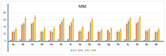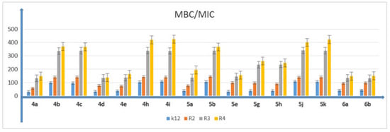In all analyzed plates where model strains K12 and R2–R4 of E. coli bacteria were treated with the analyzed compounds, MIC and MBC test values were observed for all 16 compounds but at different levels. Bacterial strains R3 and R4 were more susceptible to modification with these compounds (visible dilutions of 10–2, corresponding to concentrations of 0.0025 µM) than strains K12 and R2 (visible dilutions of 10–6, corresponding to concentrations of 0.2 µM). Strain R4 was the most sensitive of all strains, possibly due to having the longest lipopolysaccharide chain length. Based on the values in both types of tests and after the color-change analysis, the compounds 4b, 4c, 4h, 4i, 5b, 5g, 5h, 5j and 5k were used for further analyses. In all analyzed cases, MBC values were approximately 40 times higher than MIC values (Figure 3). Modification of functional groups in the tested compounds significantly changed the MBC/MIC ratios, (Figure 3, Figure 4 and Figure 5 and Table 1).
