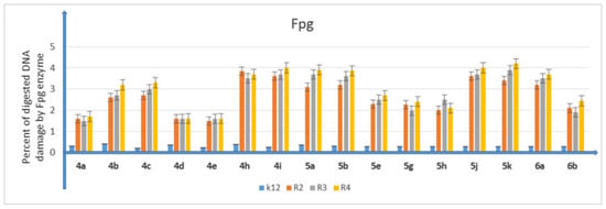 Percentage of plasmid DNA recognized by Fpg enzyme (y-axis) with model bacterial strains K12 and R2–R4 (x-axis). Compounds 4b, 4c, 4h, 4i, 5b, 5g, 5h, 5j and 5k were statistically significant at * p < 0.05 (see Table 1).