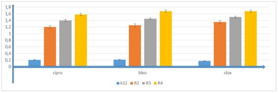 Examples of MIC with model bacterial strains K12, R2, R3 and R4 for study of the mechanisms of antibiotics ciprofloxacin and bleomycin. The x-axis features antibiotics used sequentially. The y-axis features the MIC value in µg/mL−1.
