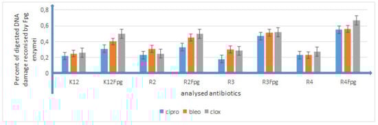 Percentage of bacterial DNA recognized by Fpg enzyme in model bacterial strains after ciprofloxacin, bleomycin and cloxacillin treatment. The compounds were statistically significant at p < 0.05.