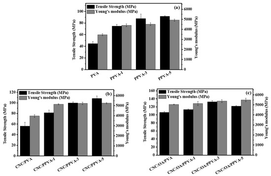 Tensile strength and Young’s modulus of different films without or with air plasma treatment. (a) PVA and its air plasma-treated films (PPVA-1, PPVA-3, and PPVA-5 are referring to the PVA films exposed to air plasma irradiation by 1 min, 3 min, and 5 min, respectively.); (b) CNC/PVA and its air plasma-treated films (CNC/PPVA-1, CNC/PPVA-3, and CNC/PPVA-5 are referring to the CNC/PVA films exposed to air plasma irradiation by 1 min, 3 min, and 5 min, respectively.); (c) CNC/OA/PVA and its air plasma-treated films (CNC/OA/PPVA-1, CNC/OA/PPVA-3, and CNC/OA/PPVA-5 are referring to the CNC/OA/PVA films exposed to air plasma irradiation by 1 min, 3 min, and 5 min, respectively).