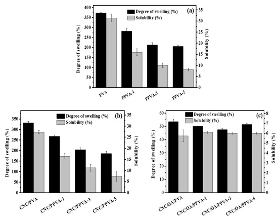 The degree of swelling and solubility of different films without or with air plasma treatment. (a) PVA and its air plasma-treated films; (b) CNC/PVA and its air plasma-treated films; (c) CNC/OA/PVA and its air plasma-treated films.