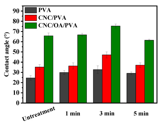 The water contact angle is considered to be an important index to quickly assess the hydrophilicity or hydrophobicity of films. The higher the contact angle is, the more hydrophobic surface the film possesses. It is clear that the contact angle of the film with plasma treatment is higher than that of the untreated film (Figure 3). Furthermore, when the time of treatment is prolonged from 1 min to 3 min, the surface of test films turned out to be more hydrophobic, reflected by their increasing contact angles in different degrees. For each series of films, their corresponding highest contact angles could all have been acquired when 3 min of treatment time was applied. As mentioned before, the plasma treatment promotes the oxidation of hydroxyl groups into carbonyl groups that are more prone to form new hydrogen bonds. Therefore, the film surface turns out to be more hydrophobic, followed by a reduced amount of hydrophilic hydroxyl groups [26]. However, this increasing trend of surface hydrophobicity could not be well maintained if the time of plasma irradiation continues to proceed. When 5 min of irradiation was applied, the contact angles of all test films dropped to different extents. The contact angle of CNC/OA/PPVA-5 film (61.5°) is even lower than CNC/OA/PVA film (65.8°) (Figure 3). This result may be attributed to the excessive etching by air plasma, which destroys the hydrophobic structure by releasing more polar groups present on the film surface.