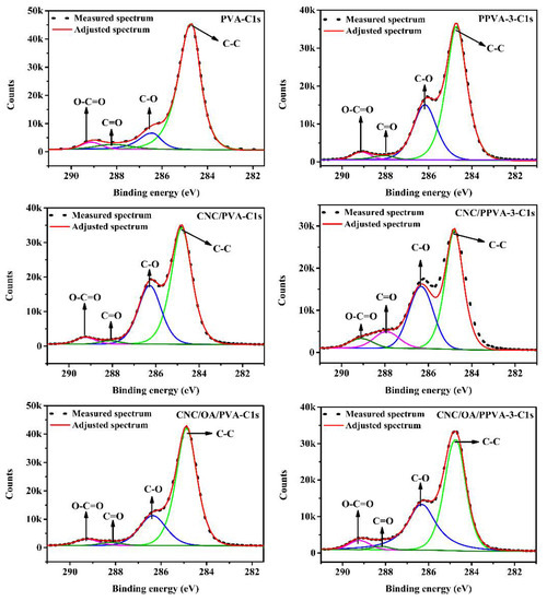 To better elucidate the elemental composition and chemical changes of plasma modified film surfaces, XPS was applied and the relevant results are summarized in Table 1. According to the relative contents of C and O atoms from the film surface, the C/O ratios of plasma modified films are calculated and the results are conspicuously lower than those of untreated films. This implies the presence of more oxygen-containing groups existing on the film surface. Here, high resolution XPS spectra of C1s and O1s were recorded to release more information regarding chemical bonding relationships (Figure 4 and Figure S1). As shown in Figure 4, four deconvoluted peaks are observed for all three types of untreated films. Their respective binding energy was detected as 284.8 eV, 286.2 eV, 288.2 eV, and 289.1 eV, corresponding to C–C [27], C–O [28], C=O, and O–C=O [29], respectively. In addition, the O1s spectra of all six films were also resolved and fitted in the Supplementary Materials (Figure S1). It is interesting to note that there is only one peak referring to C–O (531.4 eV) [30], while two more deconvoluted peaks emerged at 530.2 eV (C=O) and 533.8 eV (O–C=O) in the spectrum of PPVA-3-O1s [31]. This directly verifies the presence of newly formed carbonyl and carboxylic groups after plasma treatment. It is necessary to point out that those groups (O–C=O and C=O) are inherent in untreated CNC/PVA and CNC/OA/PVA films, which explains the existence of their corresponding signals in the spectra of CNC/PVA-O1s and CNC/OA/PVA-O1s. After plasma treatment, however, the intensities of these peaks had been evidently enhanced.