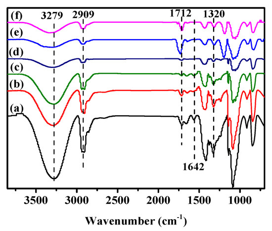 FTIR spectra of different films before and after air plasma treatment. (a) PVA film; (b) PPVA–3 film; (c) CNC/PVA film; (d) CNC/PPVA–3 film; (e) CNC/OA/PVA film; (f) CNC/OA/PPVA–3 film.