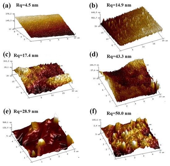 The surface morphology of films was investigated by using a Dimension Icon atomic force microscope (Bruker, Karlsruhe, Germany). The root mean square roughness (Rq) was measured by using NanoScope Analysis software.