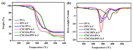 The effect of air plasma treatment on thermal stability of different films were evaluated by thermogravimetric analysis (Figure 8). As shown in Figure 8a, the weight loss occurred from 80 °C to 160 °C is due to the removal of free and bound moisture from samples. Later, two obvious weight-loss periods are observed for pure PVA film. The first period ranging from 190 °C to 380 °C is related to the dehydration of PVA sidechains and the second period ranging from 380 °C to 500 °C is ascribed to the degradation of PVA backbones [39]. For all test films, the temperature at 10% weight loss of each plasma-treated film is slightly higher than that of the corresponding untreated one (Table S1 in the Supplementary Materials). Furthermore, the onset temperature of decomposition (Tonset) and the temperature of maximum weight-loss rate (TDTGmax) of major weight-loss stages of air plasma-treated films are fairly close to those of untreated films (Figure 8b and Table S2). Despite this, it is evident to note that the PPVA-3 film loses weight more readily than pure PVA film in the temperature range from 260 °C to 320 °C (Figure 8a,b). This is probably owing to the presence of partially cleaved C–C bonds and newly formed oxygen-containing groups on the film surface after air plasma treatment. Although CNC/PPVA-3 film is more thermally stable than PPVA-3 owing to the reinforcement of CNC, its weight-loss rate is still higher than that of CNC/PVA from 272 °C to 342 °C. It is interesting to note that the difference of thermal stability between CNC/OA/PVA and CNC/OA/PPVA-3 is negligible. In spite of the chemically modified surface by air plasma treatment, the inherent crosslinking network of ester bonds in CNC/OA/PVA film still takes a crucial role in keeping its relatively high thermal stability during thermogravimetric analysis. Besides, without the reinforcement of CNC (nano-filler) and/or crosslinking network, the residual mass (8.9%) of PPVA-3 film is far less than that (22.6%) of pure PVA film, while the residual weights of the other two plasma-treated films (namely, CNC/PPVA-3 and CNC/OA/PPVA-3) are in turn slightly higher than those of their respective untreated films (Table S1, Supplementary Materials).