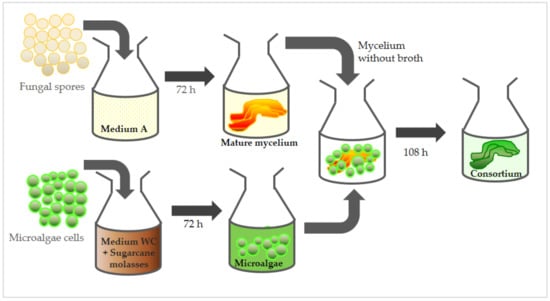 Scheme with sequence of steps for the formation of an algae-fungus consortium with S. obliquus and M. circinelloides strains.