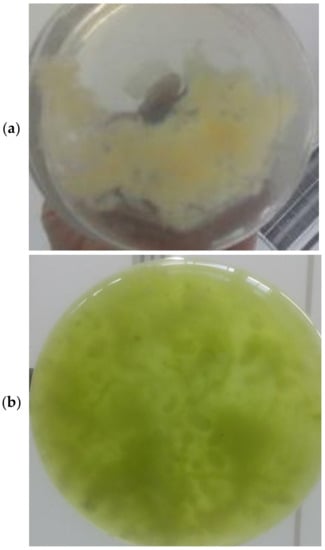 Among the challenges to be overcome, water and nutrient requirements still represent a drawback due to the ecological implications of algae’s application in natural contexts. Microalgal cells are of small size and present specific gravity values similar to those presented by their culture medium, which are not characteristic, for example, of fungal species []. Owing to this peculiarity, microalgae, if harvested using traditional methods, are associated with costly operations []. It is notorious that microalgae are microorganisms that are able to interact mutualistically with other microorganisms, such as bacteria, yeasts, other microalgae as well as filamentous fungi [,]. Specifically in terms of the interaction between microalgae and filamentous fungi, it is possible to obtain the formation of consortia, as demonstrated by different researchers [,]; in such cases, interactions can favor the synthesis of compounds that are promising for industrial bioprocesses [,,]. Based on this premise, it is possible to establish a biotechnology approach that involves different microbial species [], blended with the use of the most diverse available raw materials [].