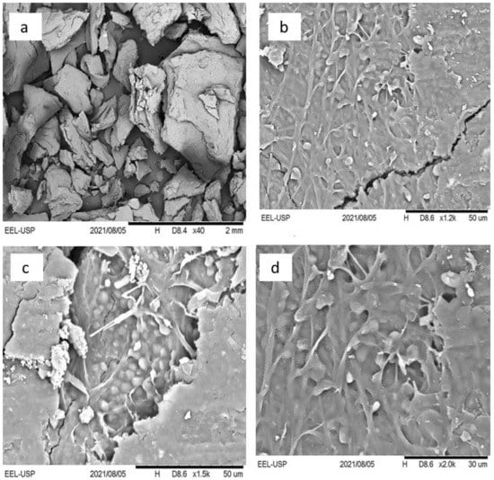 Scanning electron microscope pictures of the lichen-like structure composed of M. circinelloides mycelium and S. obliquus cells at different magnifications: (a) 40×, (b) 1200×, (c) 1500×, (d) 2000×. In (a), the image of a biomass grain of the lichen-like structure can be observed. In (b–d), the fixation of algae cells (small drop shapes with white color) and fungal hyphae (in branch format with light gray color) can be well visualized. In (c) specifically, there are clumps of algae cells in certain places where the branch fungal mycelium also predominates and forms a nest structure. In (c,d), it can be observed that some algae are interconnected among filamentous fungi.