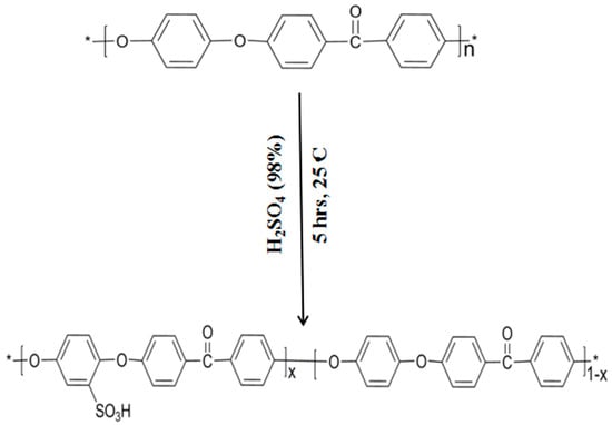 Sulfonation of PEEK polymer was carried out following the method described in literature (Figure 1) []. Firstly, 5 g of PEEK was dissolved into concentrated H2SO4 (90 mL) and stirred for 5 h at room temperature. Next, the reaction mixture was added to a container with cold water. Sulfonated PEEK (SPEEK) was obtained in the form of white precipitate. The product obtained was neutralized by excessive washing with deionized water and dried in vacuum oven at 80 °C for 8 h. The final product was the sulfonated form of polyether ether ketone with a sulfonation degree of 16.0%.