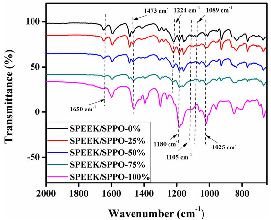 Figure 2 shows FTIR spectrums of SPEEK, SPPO and SPEEK/SPPO blended membranes. The three spectrums were similar apart from some specific peaks. The symmetric and asymmetric stretching vibrations of the sulfonic acid group for three membranes appeared at 1025 cm−1 and 1089 cm−1, respectively [,]. The intensities of these peaks are different for all the prepared blended membranes which represented the degree of sulfonation (DS) difference among these membranes. The peaks at 1105 cm−1 were due to aromatic ring. The peaks at 1473 cm−1 (C-C aromatic ring) and 1650 cm−1 (C=C aromatic ring) depicted specific bonds of SPEEK for SPPO and SPEEK/SPPO blended membranes. The –S=O stretching in the SPPO and SPEEK/SPPO blended membranes appeared at 1180 cm−1 []. Moreover, the peaks observed at 1224 cm−1 in the SPEEK and SPEEK/SPPO blended membranes corresponds to the aromatic structure (C-O-C) which was absent in SPPO membrane. It proved that SPEEK and SPPO were well blended into the SPEEK/SPPO membranes.