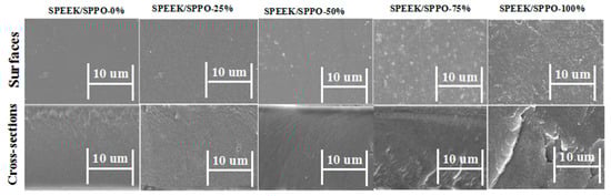 Herein, scanning electron microscopy (SEM) was utilized to investigate morphological features of surfaces and cross-sections of the fabricated SPEEK, SPPO and blended SPEEK/SPPO. Figure 3 is about SEM micrographs of the prepared SPEEK, SPPO and blended SPEEK/SPPO membranes. Results showed that all the membranes exhibited homogeneous morphologies. The surfaces and cross-sections of pristine SPEEK membrane were highly transparent. There was no hole in the prepared blended membranes except SPEEK/SPPO-25% and SPEEK/SPPO-100% membranes. The morphology of the blended membranes becomes rougher with the incorporation of SPPO into the polymer matrix as shown in Figure 3. Both the polymers contain hydrophilic group (-SO3H), indicating the good compatibility with each other []. Therefore, the blended membranes were prepared without any notable defects. Overall, all the prepared blended membranes represented homogeneous structure which is useful for proton conductivity of PEMs.