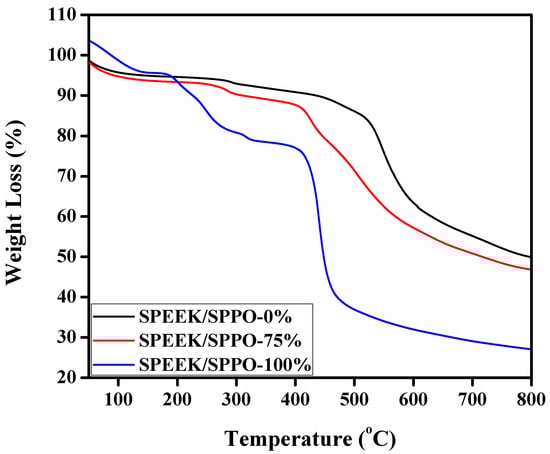 TGA thermograms of the fabricated blended membranes (where 0, 75 and 100% represent the amount of SPPO into the SPEEK/SPPO blended membranes).